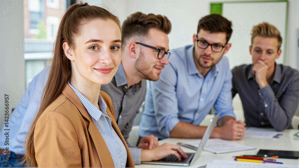 Team portrait full of ambition for success in a bright meeting room with a smiling young woman looking at the camera while a diverse young business team works collaboratively in the background #1423666957