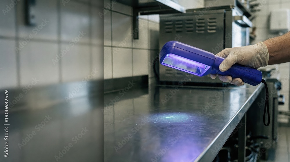 Technician Inspecting Stainless Steel Surface with Ultraviolet Flashlight in Commercial Kitchen Environment to Optimize Hygiene Verification and Prevent Contamination Risks #1900682579