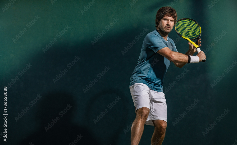 Tennis player. Energetic athlete in motion playing tennis match on court showing dynamic movement power and determination #1786558088