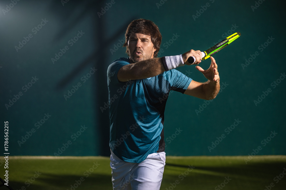 Tennis player. Energetic athlete in motion playing tennis match on court showing dynamic movement power and determination #1786562215