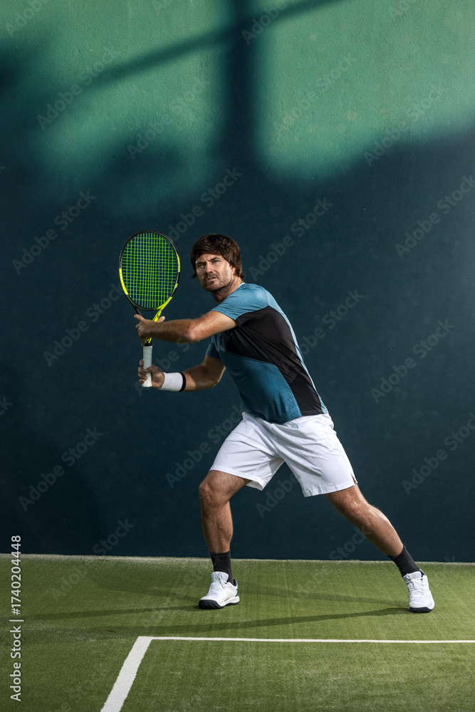 Tennis player hitting a ball during an intense match on court. Focused male athlete in action with racket and ball captured in dramatic lighting for sports advertising and editorial #1740204448