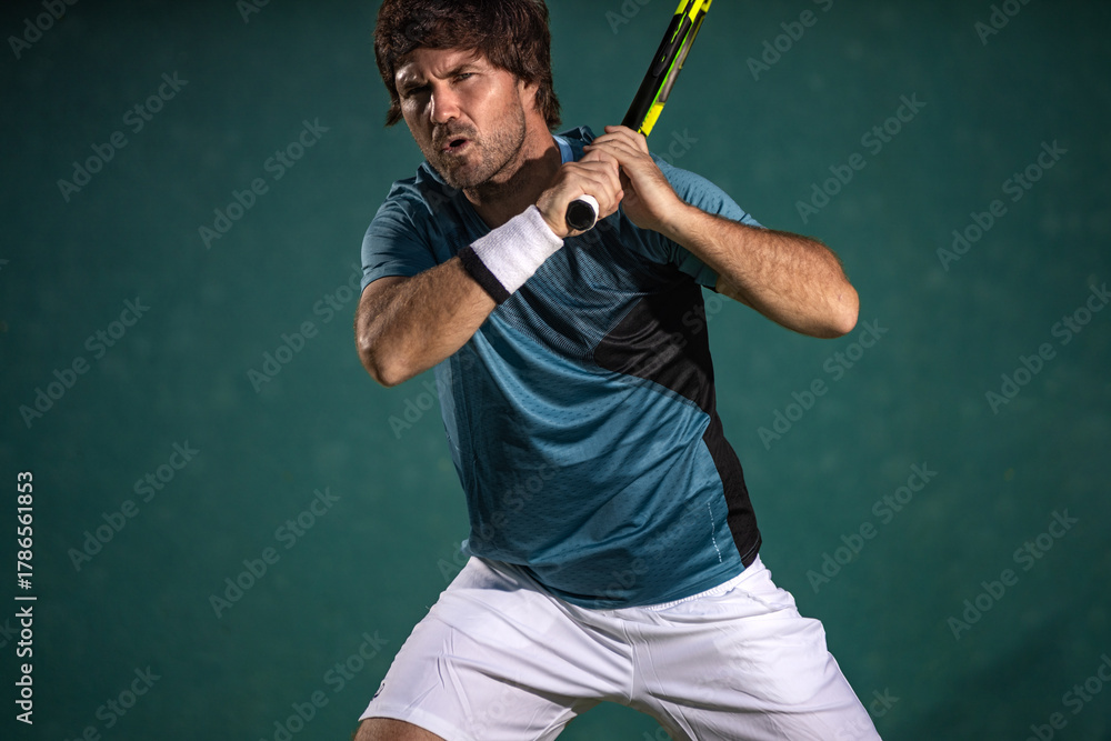 Tennis player hitting a ball during an intense match on court. Focused male athlete in action with racket and ball captured in dramatic lighting for sports advertising and editorial #1786561853