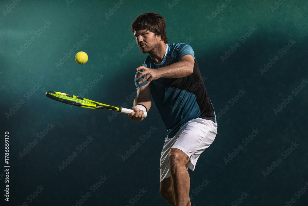 Tennis player hitting a volley close to the net during an intense match on court. Focused male athlete in action with racket and ball captured in dramatic lighting for sports advertising and editorial #1786559170