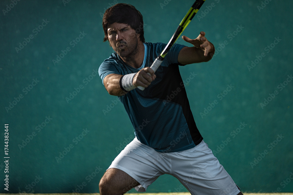 Tennis player in action on professional outdoor court. Focused male athlete in action with racket and ball captured in dramatic lighting for sports advertising and editorial #1744382441