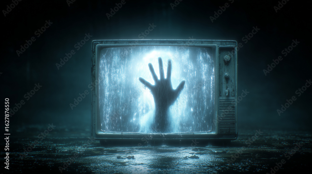 Terrifying horror scene with ghost hand reaching from vintage television screen. scary, dark, blue, and supernatural display of frightening paranormal entity #1627876550