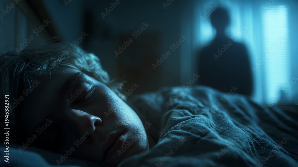 Terrifying shadow figure watching sleeping person at night bedroom scene #1945382971