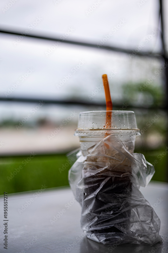 Thai Iced Black Coffee In Plastic Cup Left On Table Until Ice Melts #1955557277