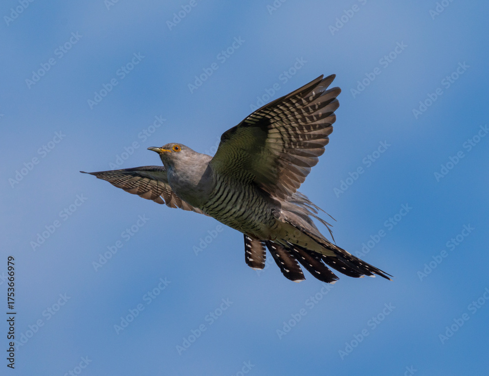 The common cuckoo bird flies against the blue sky with its feathers and wings spread. #1753666979