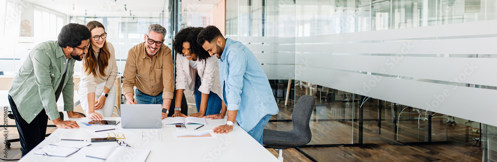 The diverse team of professionals engage in a dynamic exchange of ideas, with open laptops suggesting a collaborative working session. A productive and cooperative team during a creative brainstorm. #728701602