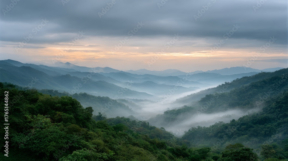 The mountains are covered in trees and the sky is cloudy #1765144862