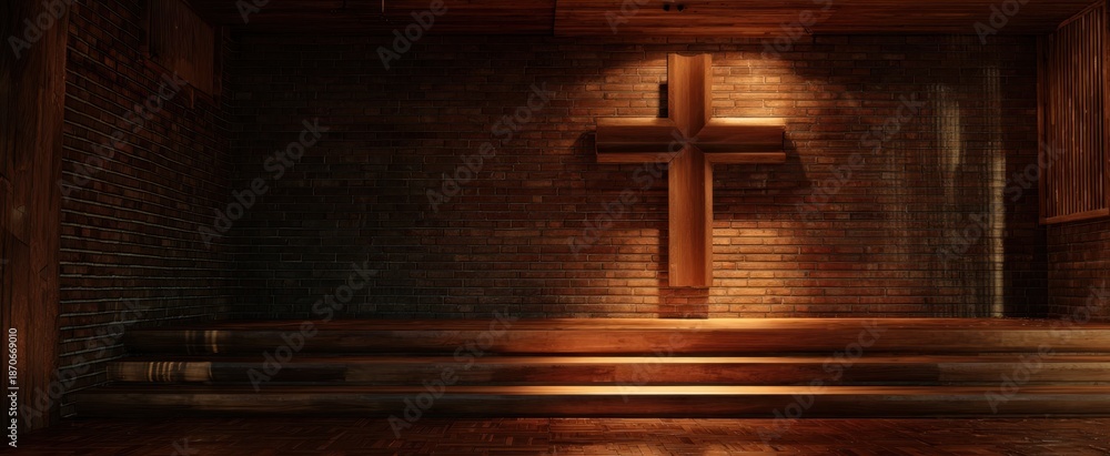 The wooden cross illuminated on a brick wall inside a quiet rustic chapel #1870669010