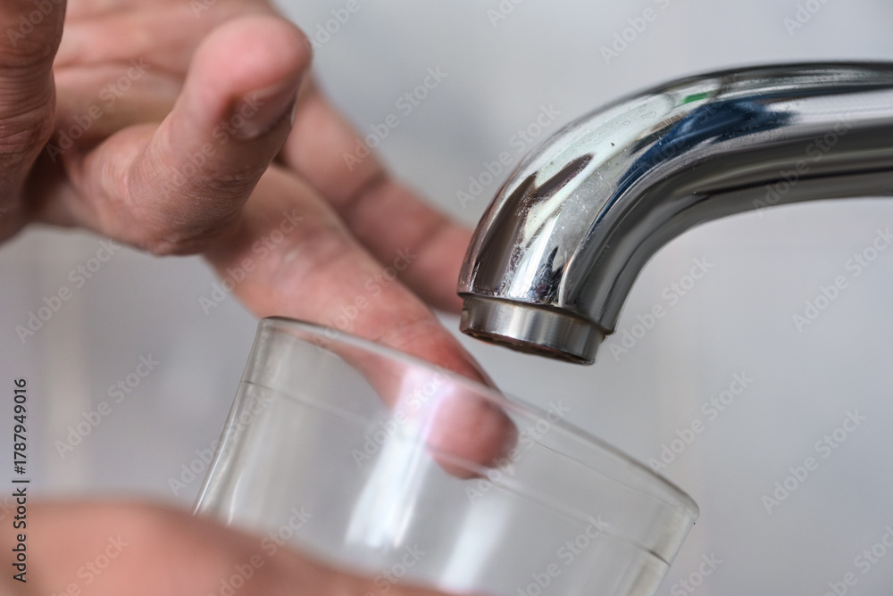 Thirst man wanting to drink and holding glass under faucet, but water was turned off. Empty glass under dry faucet, water shortage or plumbing issue #1787949016