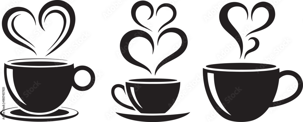Three cups of coffee with heart shaped steam black and white #1807457921