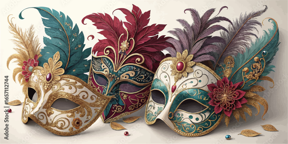 Three ornate venetian masks with feathers and embellishments in varying colors and designs are displayed #1657112744