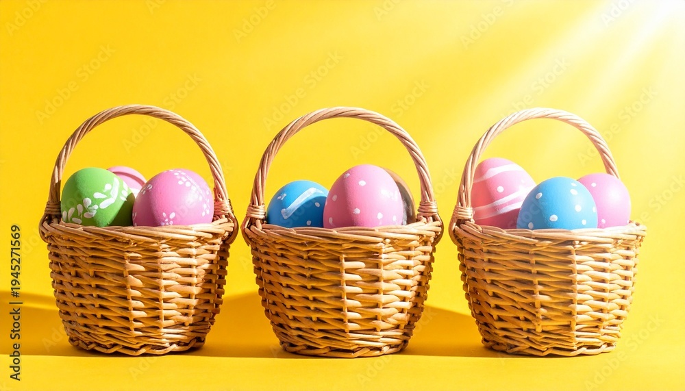 Three wicker baskets with colorful decorated Easter eggs against yellow background symbolizing festivity joy and seasonal tradition #1945271569
