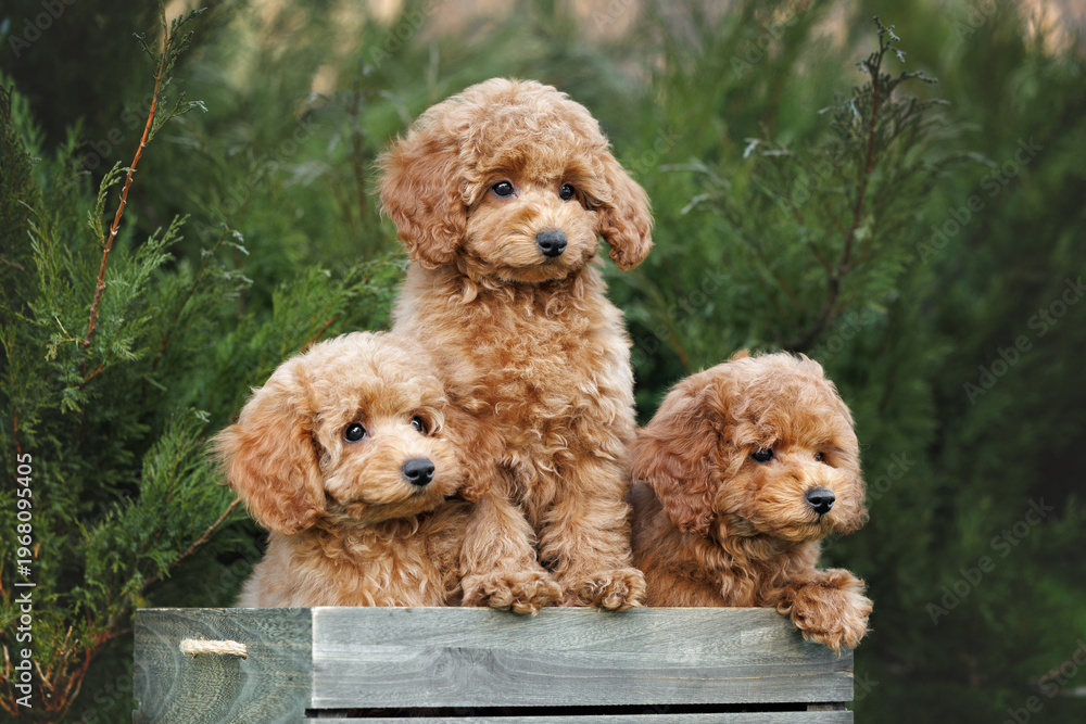 threee miniature poodle puppies posing together in a wooden box outdoors #1968095405