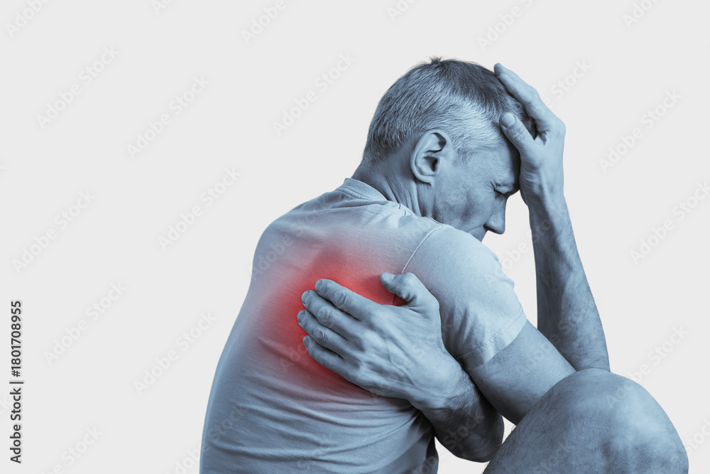 Tired man suffering from nerve ache massaging his back on gray background. Grayscale photo of man with neck pain, red accent marks hernia or arthritis inflammation #1801708955