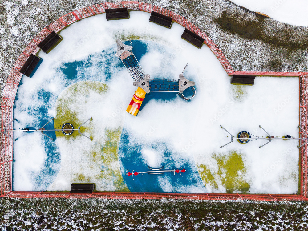 Top-down aerial drone view of a modern children's playground partially covered in snow, featuring colorful surfaces and a red safety border. #1935566881