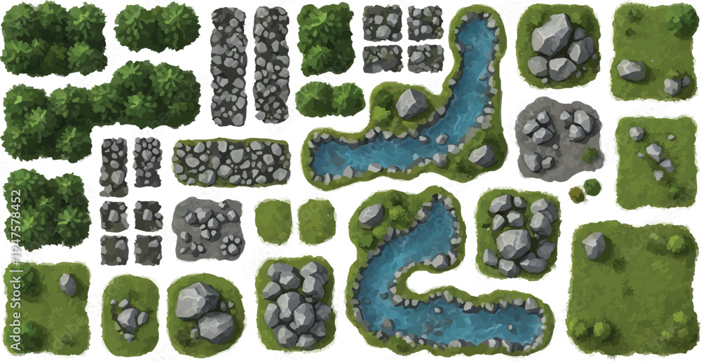 Top-down view of a versatile vector game asset set featuring various green grass tiles, winding blue rivers, lush bushes, and gray rock formations #1947578452