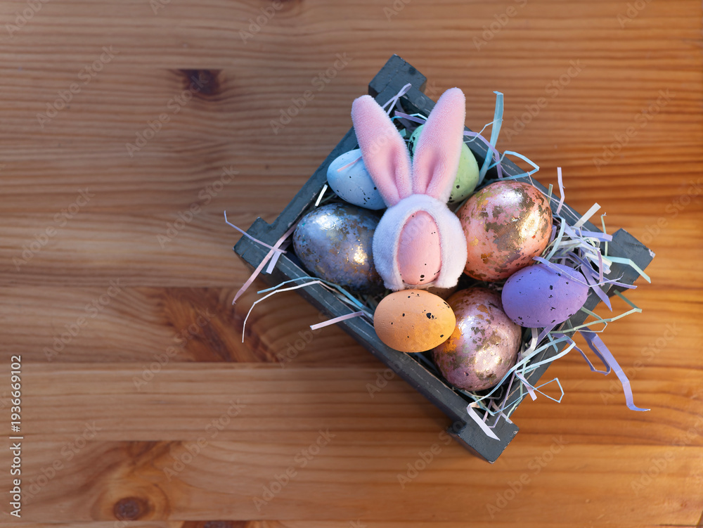 Top view easter eggs and soft bunny ears in a box with pastel straw on a wooden table. A festive spring backdrop for decorations and greeting cards #1936669102