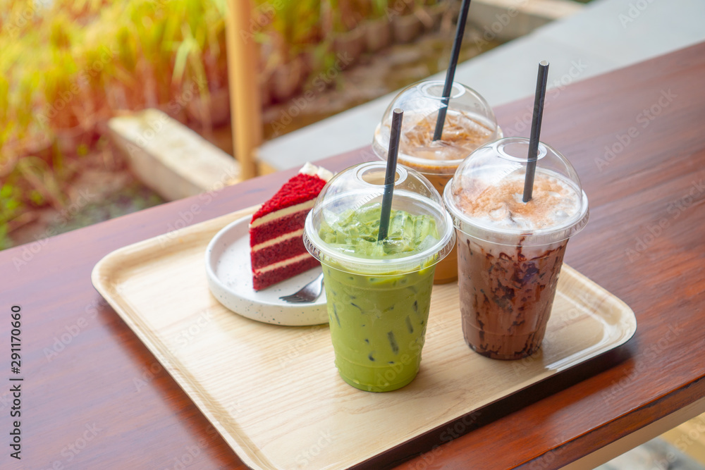 Top view of green tea ice with milk, espresso coffee ,chocolate milk and strawberry cake on wooden tray with warm light tone. Drink and dessert in coffee shop. food for relax and fresh concept. #291170660