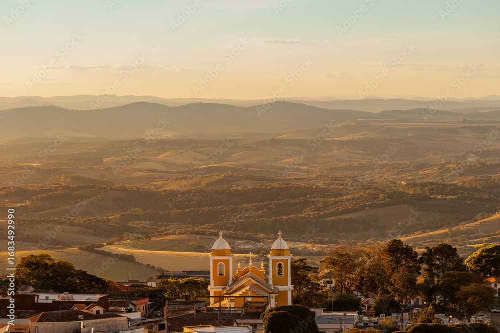 Torres da Igreja e belissíma paisagem das montanhas no pôr do sol, São Thomé Das Letras, Minas Gerais #1683492990