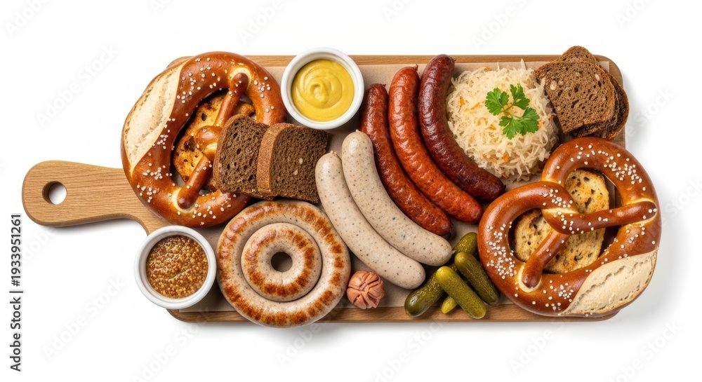 Traditional bavarian feast with pretzels, sausages, mustard, and sauerkraut on wooden board #1933951261