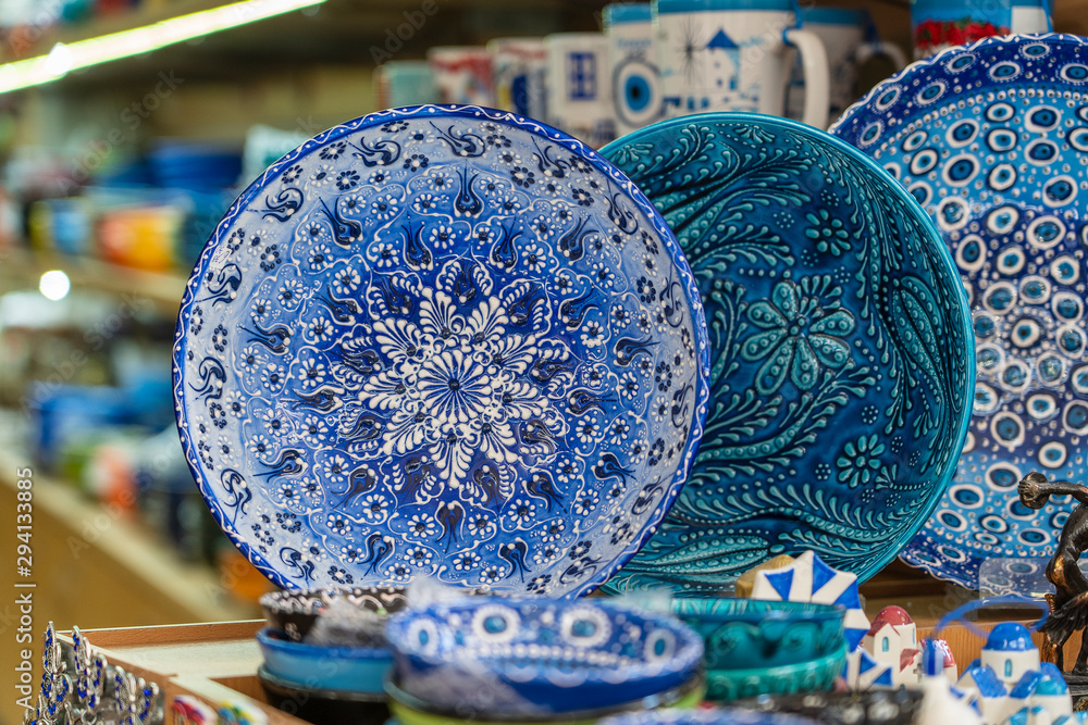 Traditional colorful greek souvenir ceramic plate for sale for tourists in a street shop, closeup. Kos island, Greece. #294133885