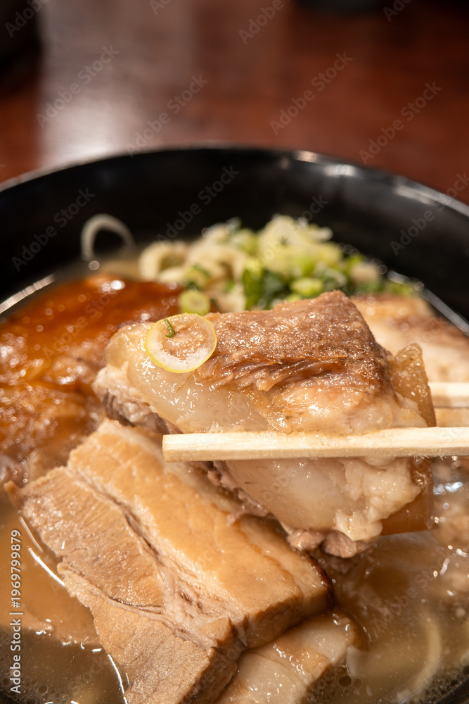 Traditional Okinawa Soba noodle soup with pork belly and ribs in a black bowl. #1969799879