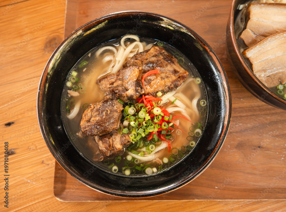 Traditional Okinawa Soba noodle soup with pork belly and ribs in a black bowl. #1971080408
