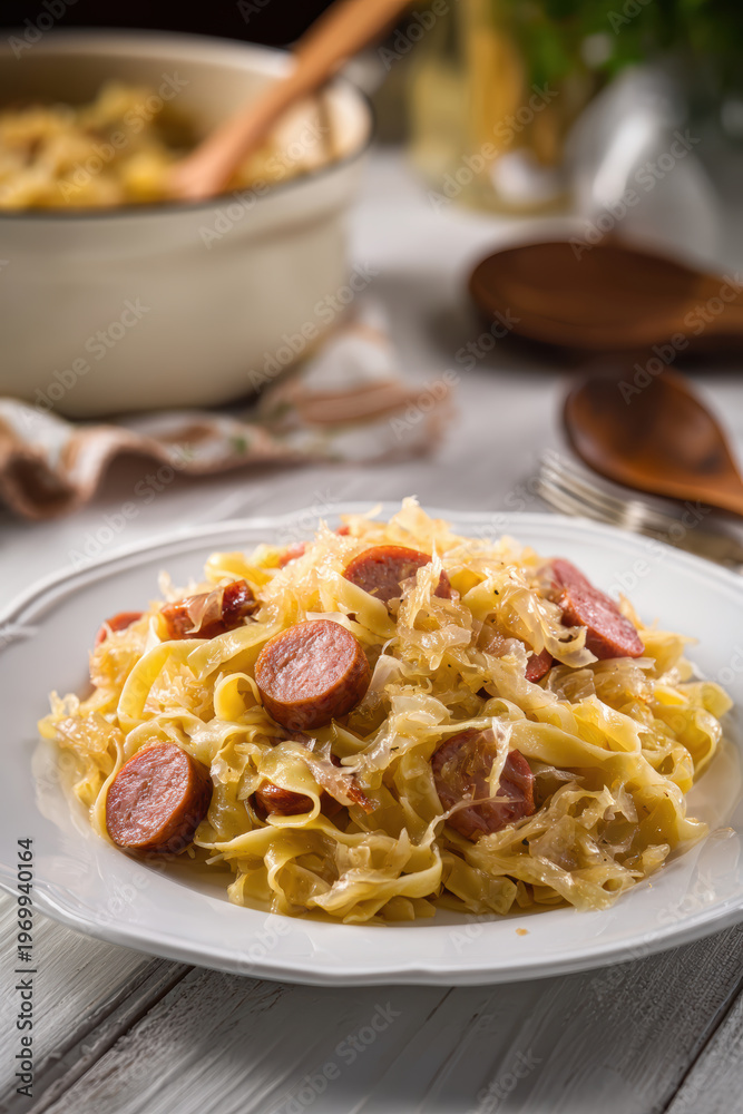 Traditional Polish Łazanki with Sauerkraut and Sausage – Homemade Comfort Dish. AI generative. #1969940164