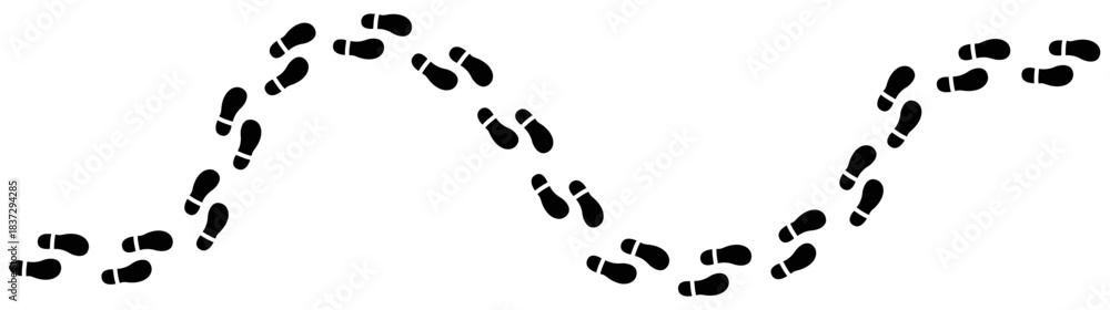 Trail of black shoe footprints following a wavy path for represent tracking, search, or a winding journey #1837294285