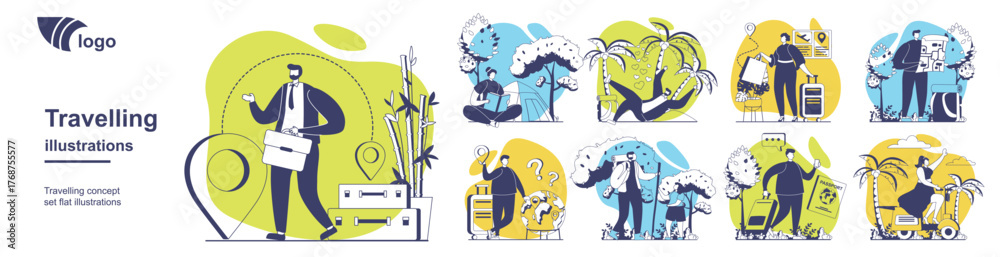Travelling concept set for web design. Collection with people with luggage go on vacation, resting in summer camping, relaxing at sea beach, hiking outdoors, go in global travel. Vector illustration. #1768755577