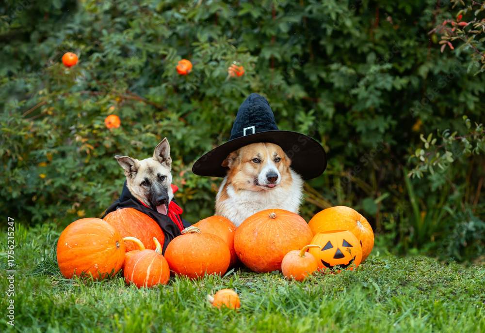 Two cute funny dogs in a carnival cape and party hats sit among orange pumpkins on Halloween in an autumn garden #1756215247