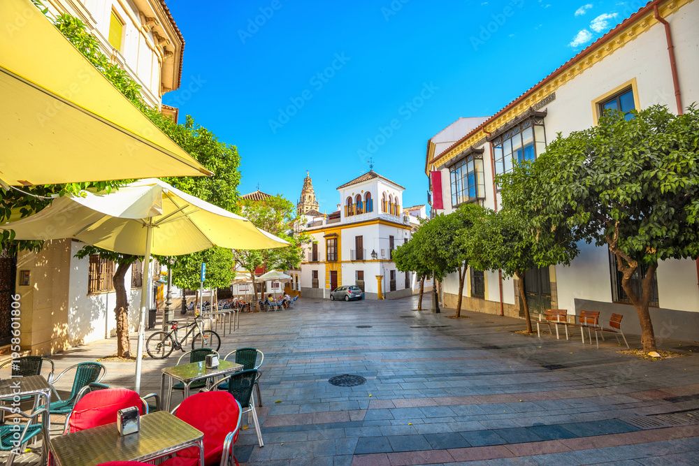 Typical street with outdoors cafe in old historical district in Cordoba. Andalusia, Spain #1958601806