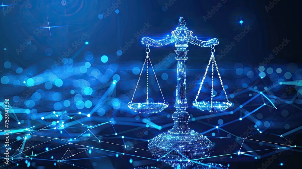 Unbiased Artificial Intelligence, Scales Of Justice In Digital World Concept. Digital Illustration Scales On Futuristic Blue Data Network Background. Fairness And Equality In Ethical Ai Systems #753941332