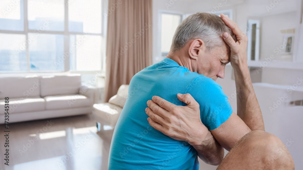Upset tired young man feeling muscular pain after injury. Pain under the shoulder blade in man sitting in living room, symptoms of tension or trapped nerve #1733545188