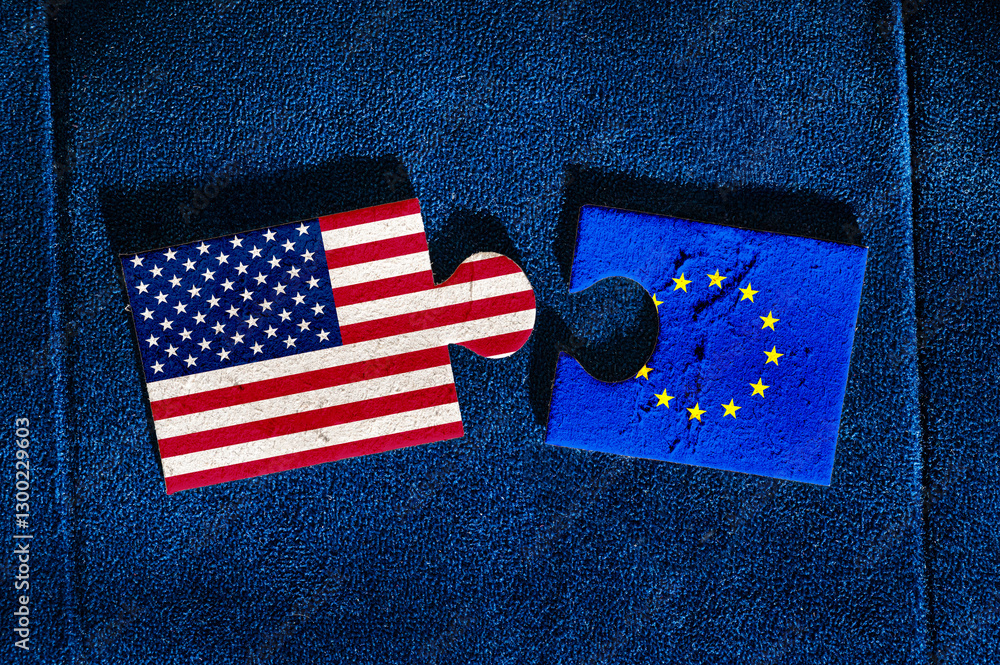 USA vs EU. Tensions Between the United States of America and European Union. Disconnected Puzzle Pieces Symbolize Broken Relations and Geopolitical Disputes. #1300229603