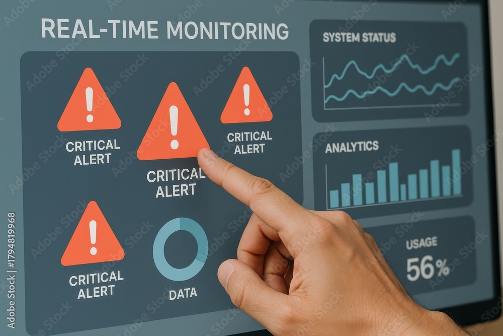 User interacting with real-time monitoring dashboard displaying critical alerts and analytics. Concept of data management, urgency, and IT system performance tracking. #1794819968
