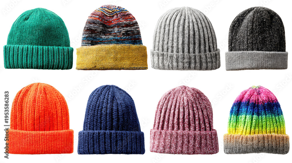Variety of knitted hats displayed in various colors and patterns on a plain background #1953586283
