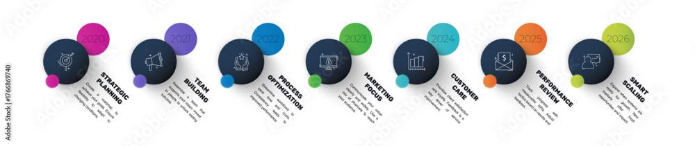 Vector infographic design template. Modern timeline concept with seven steps, circles. Vector illustration used for diagram, workflow layout, banner, webdesign #1766869740