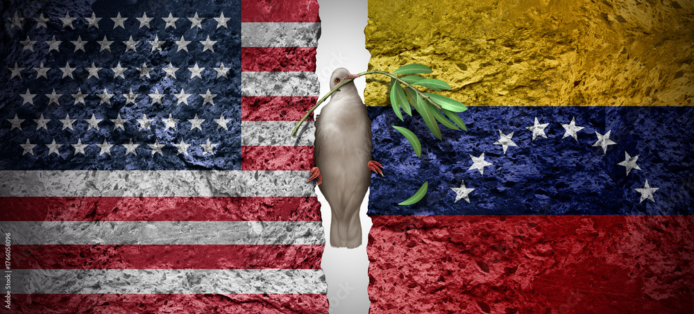 Venezuela United States Crisis as Cracas government and Washington administration conflict as an American and Venezuelan diplomatic failure in war or unrest with a white dove and olive branch. #1766058096