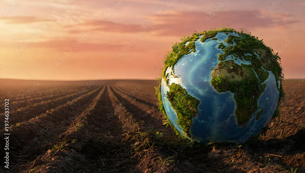 Vibrant Earth Globe Adorned with Lush Greenery and Blue Waters, Resting in a Fertile Field Under a Golden Sunset Sky, Symbolizing Growth and Sustainability #1974633702