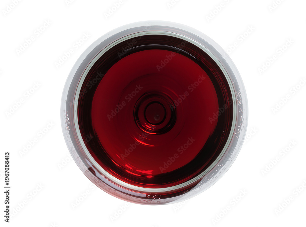 Vibrant red wine in a clear glass, viewed from directly above, showcasing a rich, deep crimson liquid surface, isolated PNG for beverage and celebration designs #1967088413