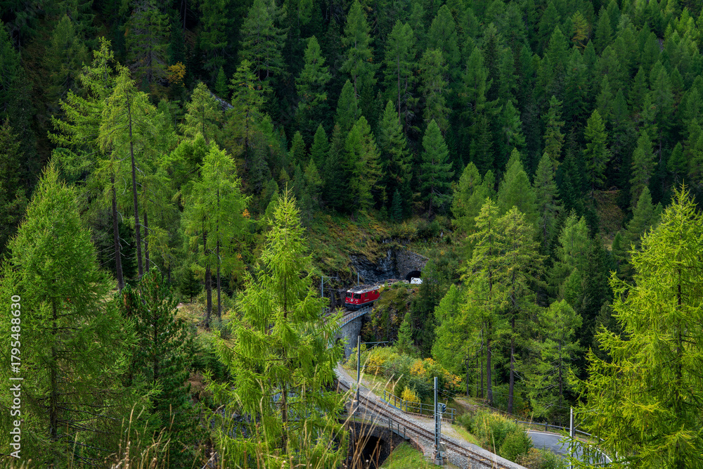 View of a freight train in the Swiss Alps. #1795488630