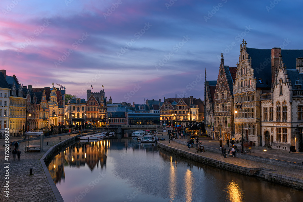 View of Graslei, Korenlei quays and Leie river in the historic city center in Ghent (Gent), Belgium. Architecture and landmark of Ghent. Sunset cityscape of Ghent. #1732668022