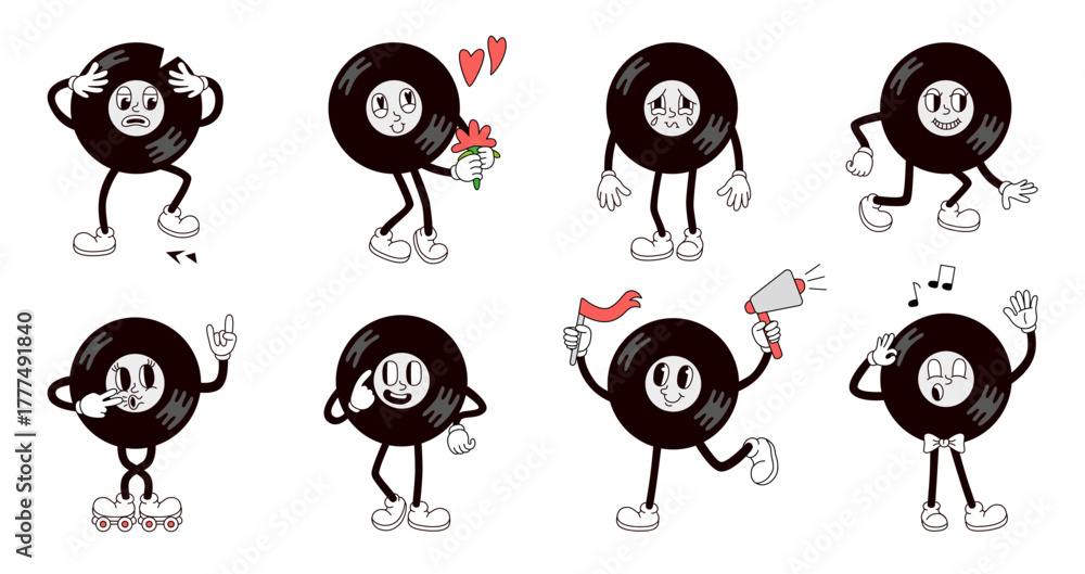 Vinyl retro character. Vinyl record mascot various poses and emotions. Music symbol in love, singing and on rollers. Groovy musical store neoteric vector symbol #1777491840