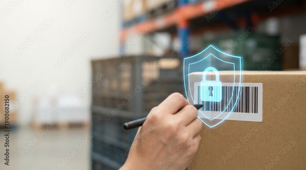 Warehouse package scanning with barcode validation using digital pen and cybersecurity shield icon for secure inventory management and supply chain optimization #1900682150