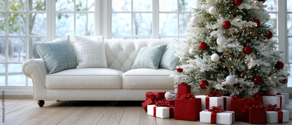 Warm and inviting living area features a couch adorned with cushions, holiday decor, and a Christmas tree amidst snowy views #1748244656