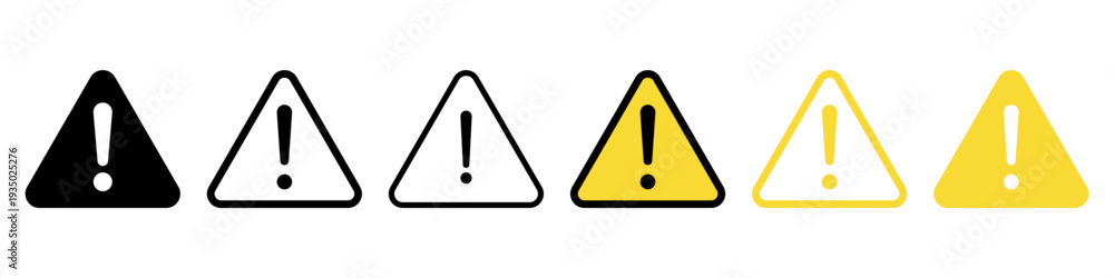 Warning triangle icons with exclamation mark in outline and solid styles. Safety alert symbols used for danger notice, risk indication, attention messages. #1935025276